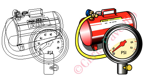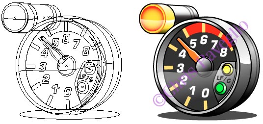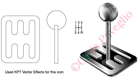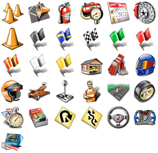 I developed a set of icons for my sport/hobby of Autocrossing in 2004. All were created by starting with a reference photo of the object I wanted, tracing the basic shape, then cleaning up the line, then simplifying it, then making sure it would look good at small sizes, which meant simplifying or exaggerating some features. As many of the colors and gradients wer done in Illustrator so they could be fixed or modified there. They were kept in Illustrator as long as possible before being put into Photoshop to export at icons. Some shadows or transparent objects were done in PS because that was easier or more quickly done.