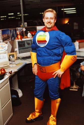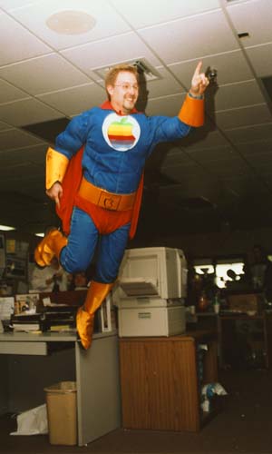 When I started at work, on the night shift, there was no one that could fix anything there. We had no IS department to take care of our needs. So me, being rather handy and knowledgeable, started to jump right in to fix printer jams, replace toner, and it grew to helping people fix weird computer problems, font problems, you name it, I fixed it. I got myself (a very positive) reputation for helping out without making a fuss about things. So I was soon coined with being "A super mac fix it guy". I asked one of my friends (Mr. Paul McGuigan) if he could cartoon me a picture of me as a superhero. Lo and behold many months later, I was gifted "SuperMacGuy"! And thus was officially born SuperMacGuy.