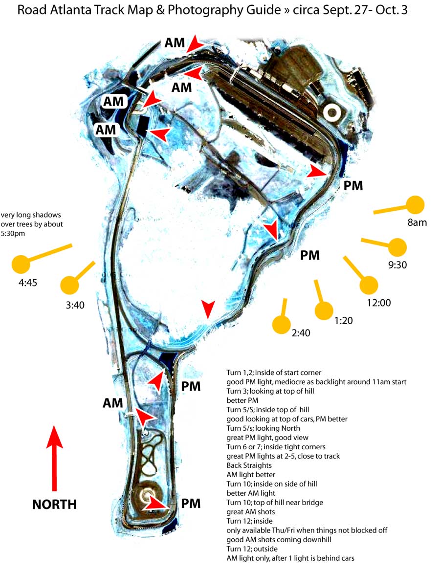 I was making a sun plot of the way the light hits the track, so I could shoot better. Take a look at this map for the best locations to shoot from and how the sun points at various times of the day. Last year most of my pix were into the sun and the cars were washed out, this year I was prepared and got at the right corners in the AM vs. PM.